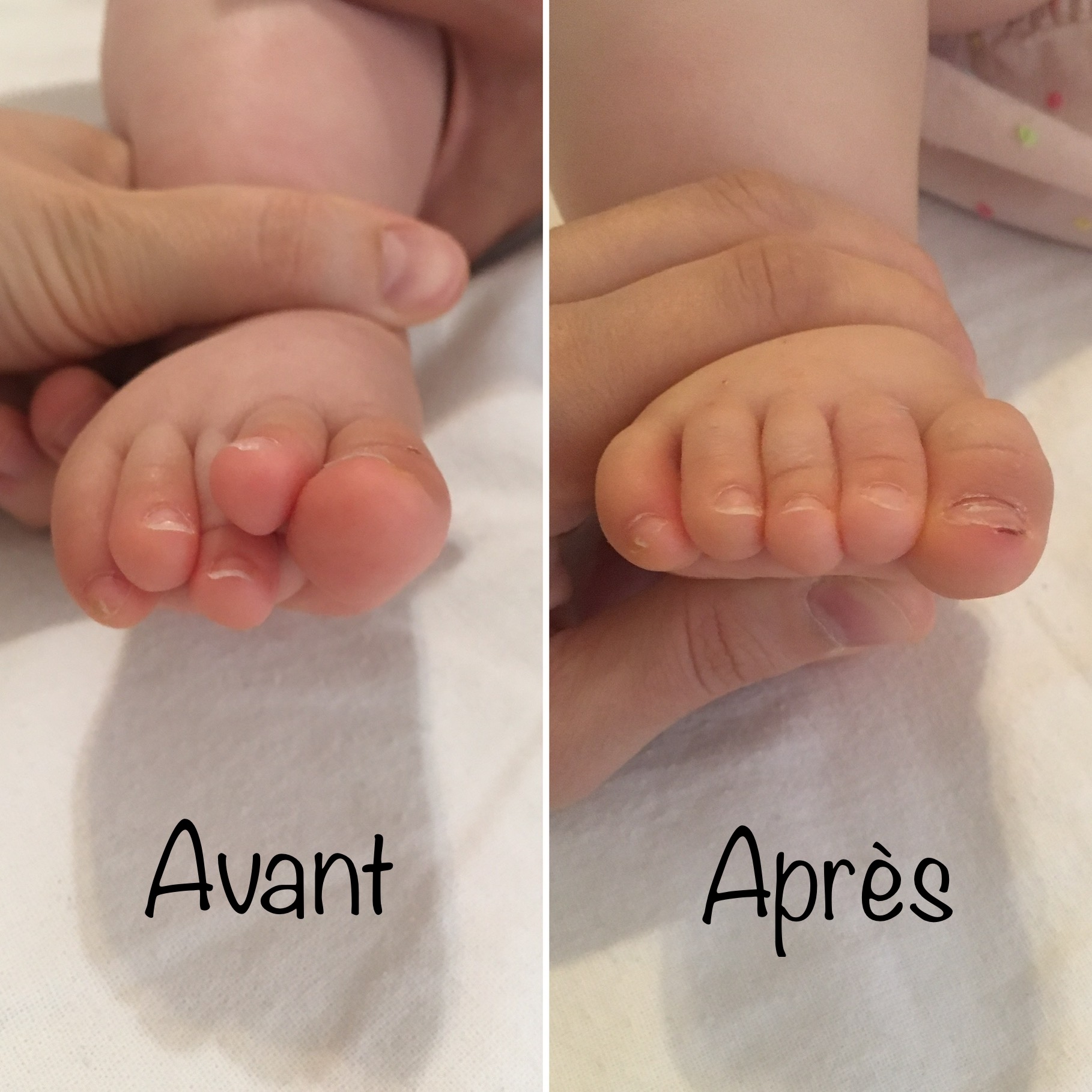 Ce traitement est à réaliser avant 1 an pour un résultat optimal (le mieux étant avant 6 mois). Après 1 an, un chaussage large est préconisé tout en favorisant la marche pieds nus. Passé cet âge, si le chevauchement persiste consultez un professionnel spécialisé (kinésithérapeute, orthopédiste pédiatrique, podologue).